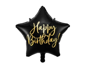 Błyszczący balon foliowy w kształcie gwiazdki w kolorze czarnym ze złotym metalizowanym napisem Happy Birthday, rozmiar przed napompowaniem ok. 47 cm (18.5''), rozmiar po napompowaniu ok. 40 cm (15.5'').