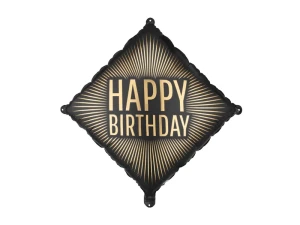 Balon foliowy w kolorze czarnym ze złotym napisem ''Happy Birthday''. Wymiary przed napompowaniem ok. 54 x 54 cm (20 x 20''), wymiary po napompowaniu ok. 46 x 46 cm (18 x 18''). Do napompowania powietrzem i helem.