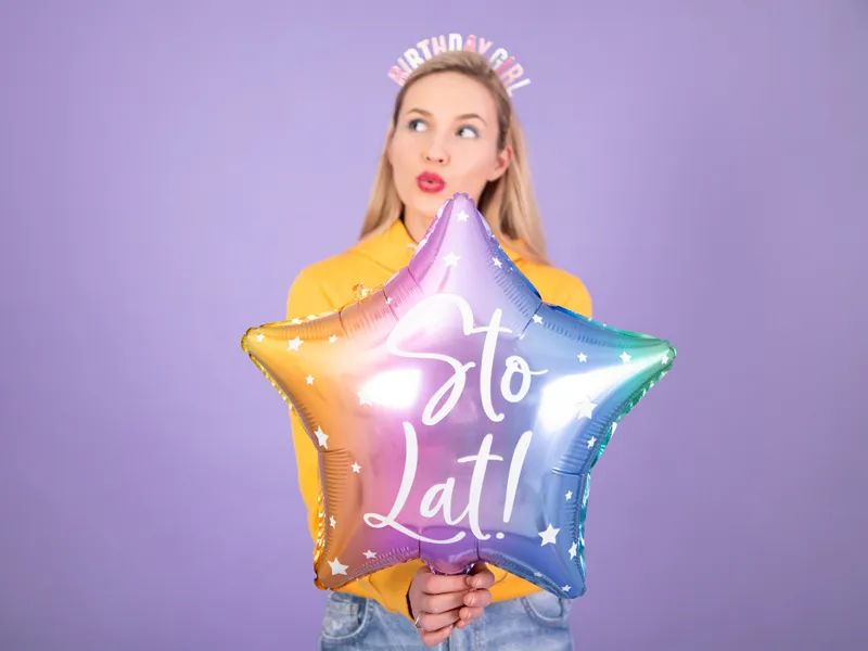 Błyszczący balon foliowy w kształcie gwiazdki, mix kolorów z białym napisem Sto Lat!, rozmiar przed napompowaniem ok. 47 cm (18.5''), rozmiar po napompowaniu ok. 40 cm (15.5'').