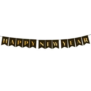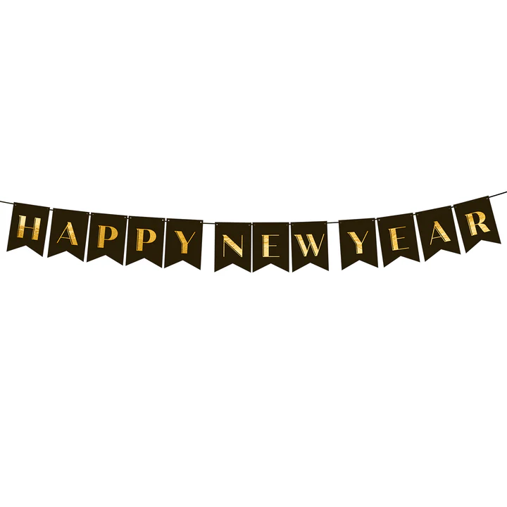 Baner w kolorze czarnym ze złotym napisem Happy New Year, do samodzielnego złożenia, zestaw zawiera literki i ok. 2,5 m czarnej tasiemki, wymiary po złożeniu: wysokość ok. 20 cm, szerokość flag ok. 14,5 cm, długość: 250 cm