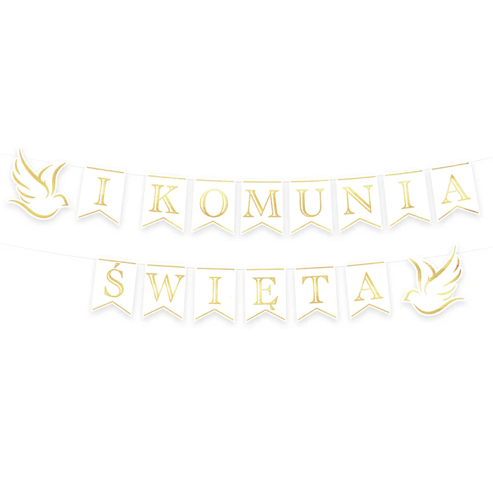 Piękny klasyczny baner na komunię składający się z 14 białych flag, delikatnie ozdobionych złotymi paskami, tworzących złoty napis I Komunia Święta. Dwa biało-złote gołąbki dołączone do banera, pięknie podkreślają charakter uroczystości.