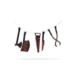 Wykonana z papieru oraz sznurka strrrraszna girlanda z zakrwawionymi narzędziami. Na sznurku znajduje się 5 narzędzi: nóż, tasak, piła, siekierka oraz obcęgi. Długość 100 cm. Długość narzędzi ok 30 cm. Doskonała dekoracja halloweenowa lub na imprezę w stylu horror party.