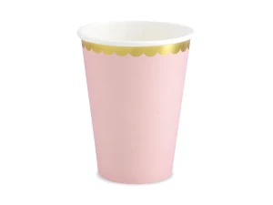 Kubeczki papierowe w kolorze jasnoróżowym ze złotymi metalizowanymi brzegami, pojemność ok. 220 ml.