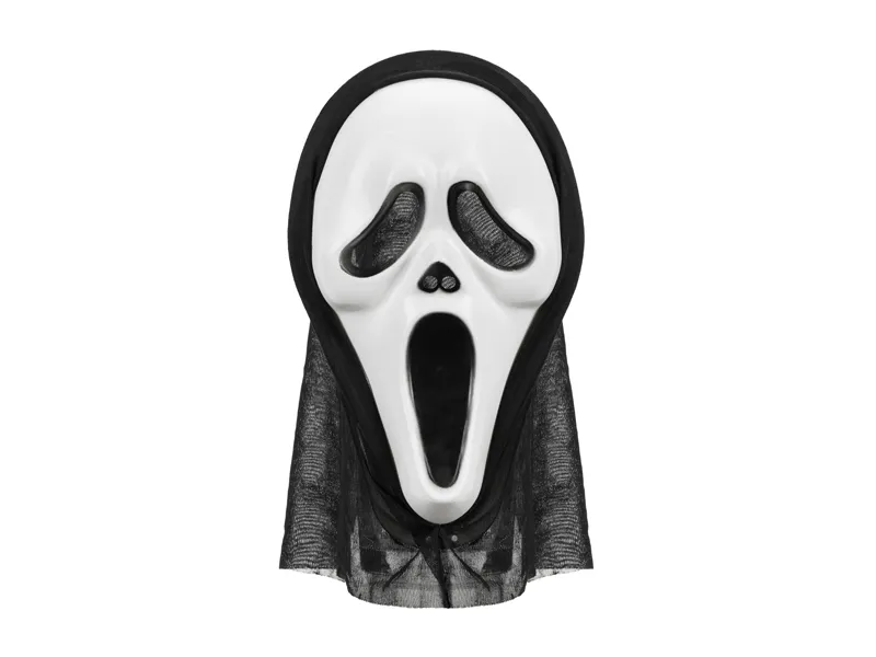 Maska z kapturem Halloween w kolorze biało-czarnym, wymiary maski ok. 18 x 31 cm, długość kaptura ok. 38 cm.