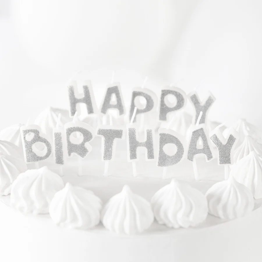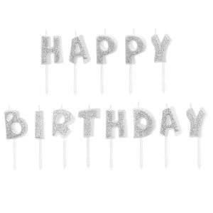 Świeczki urodzinowe napis Happy Birthday srebrne brokat