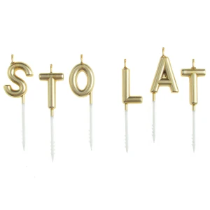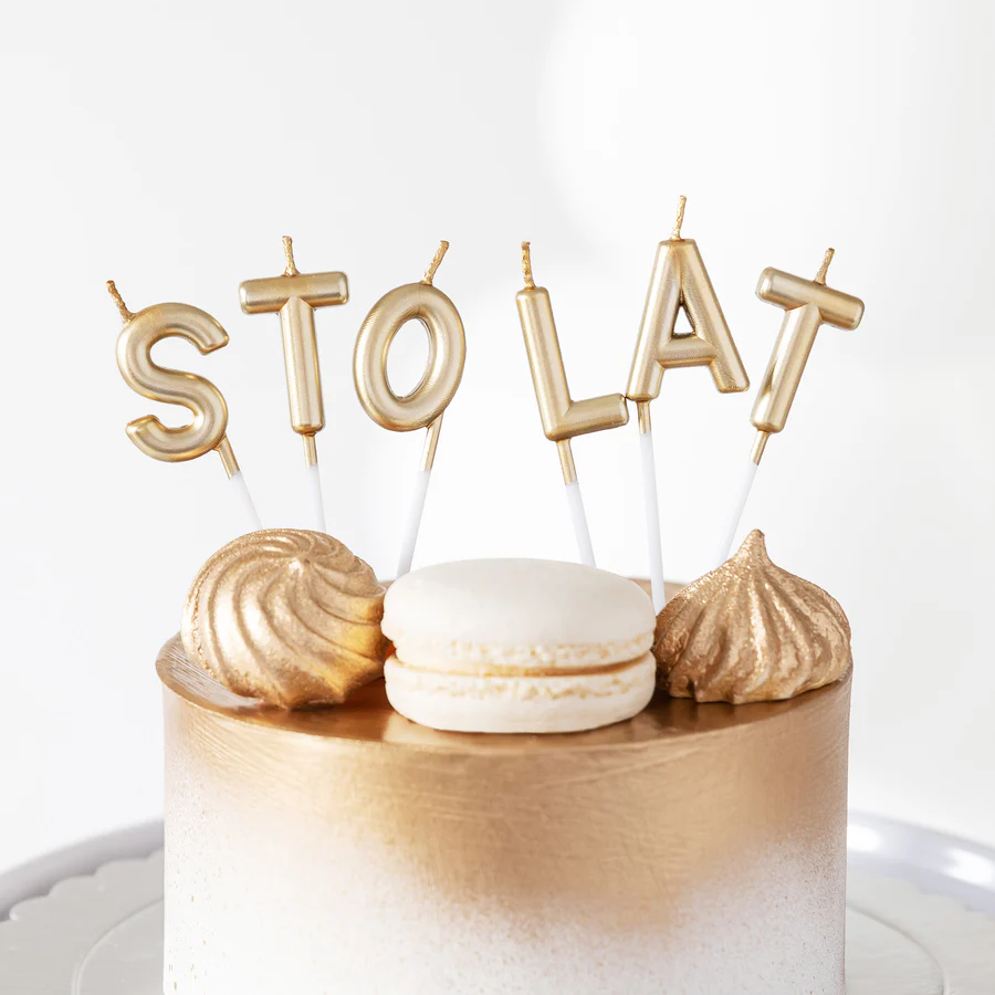 Świeczki urodzinowe Sto Lat złote, wysokość ok. 7 cm.