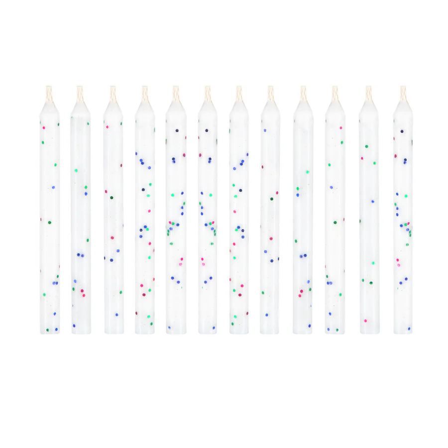 Świeczki urodzinowe niegasnące białe z kolorowym brokatem