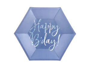 Talerzyki papierowe w kolorze granatowym z holograficznym napisem Happy B'day!, średnica ok. 20 cm.