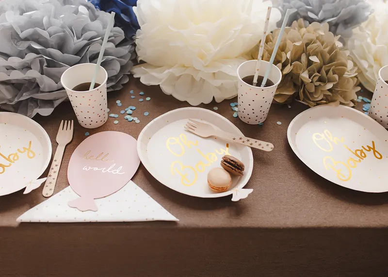 Talerzyki papierowe w kształcie balonika z napisem Oh baby, wymiary ok. 17.5 x 22 cm.